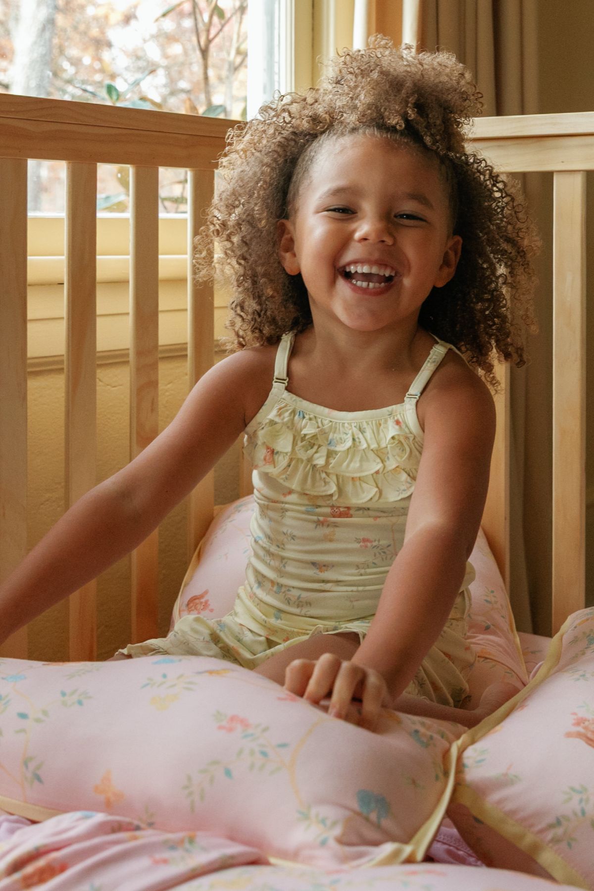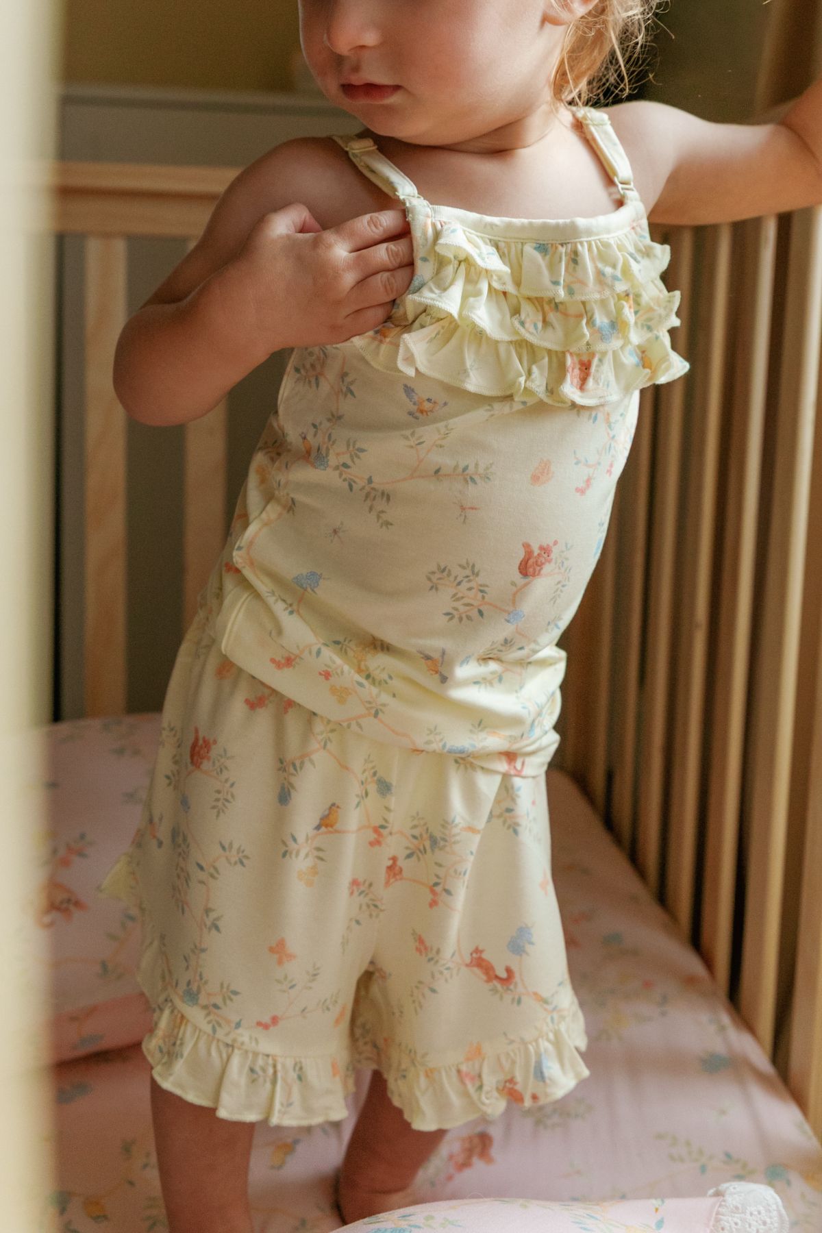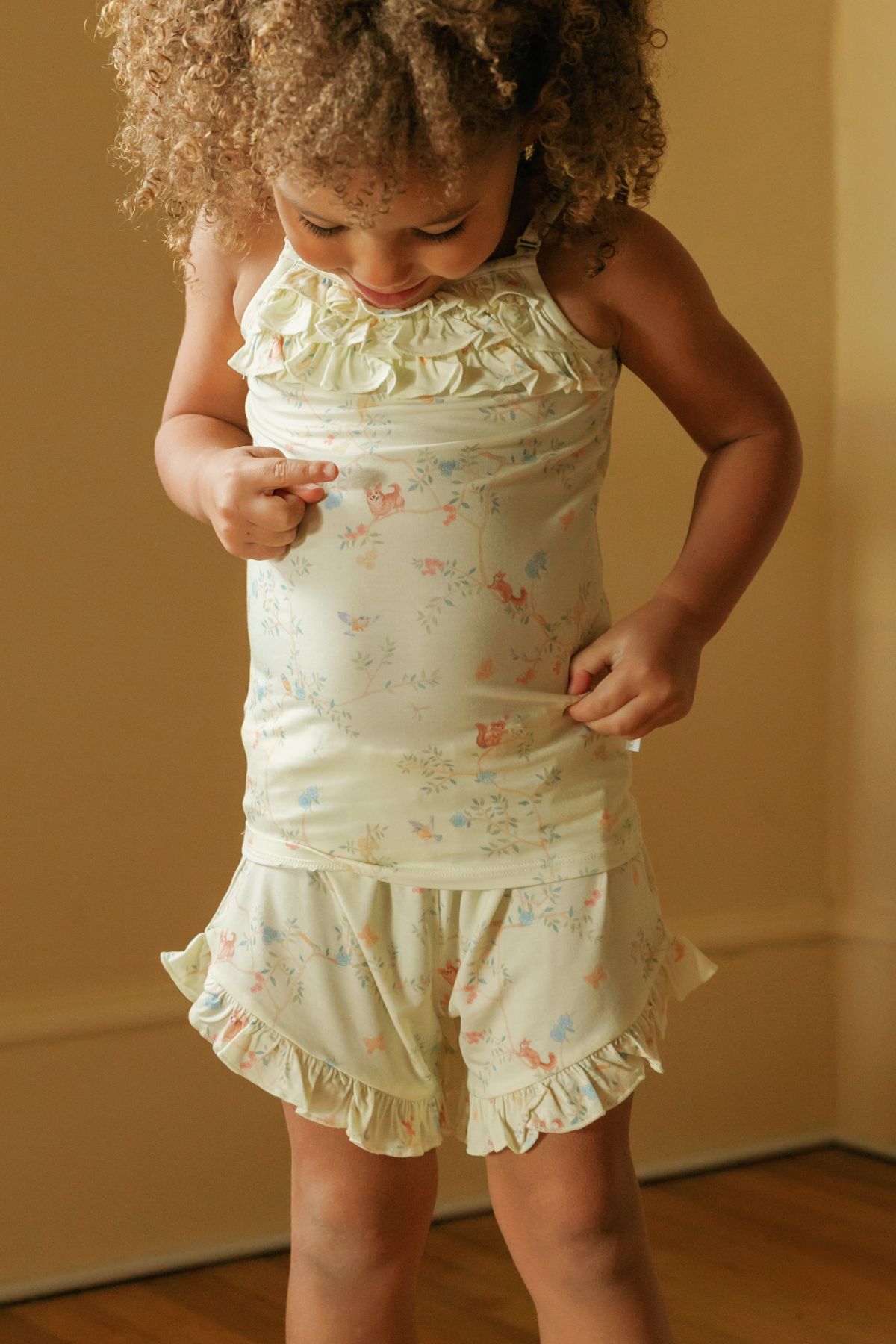 Soft, breezy, and effortlessly charming, the Chinoiserie Cascade T-Shirt and Shorts Set features a delicate tiered frill front that falls beautifully with every movement. Designed with adjustable spaghetti straps for a comfortable fit, the top pairs perfectly with matching frill-trim shorts for an easy, put-together look. Finished in our timeless Chinoiserie print, this two-piece set is made for warm days, play, and everyday elegance.