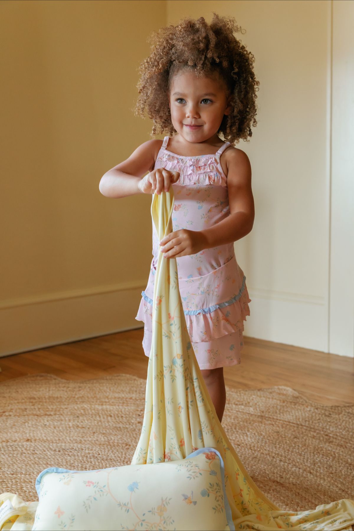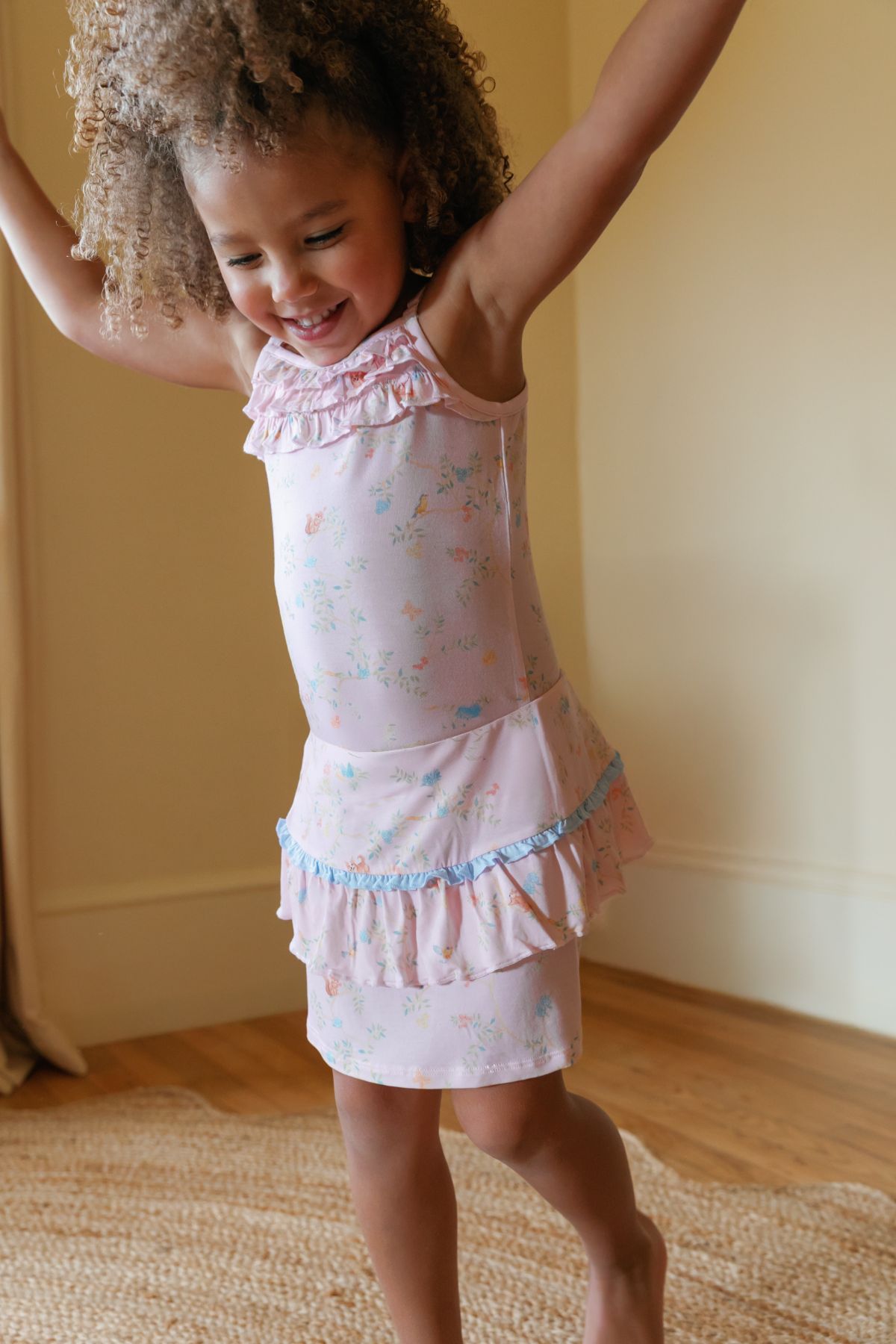 Soft and graceful with a playful twist, the Chinoiserie Cascade T-Shirt and Skirt Set in pink features our signature cascading frill detail that moves beautifully with every step. The lightweight T-shirt is designed for all-day comfort, paired with a matching skirt finished with gentle frill trims for an effortlessly polished look. Rendered in a delicate pink Chinoiserie print, this two-piece set is perfect for warm days, celebrations, and everyday moments dressed just a little more special.