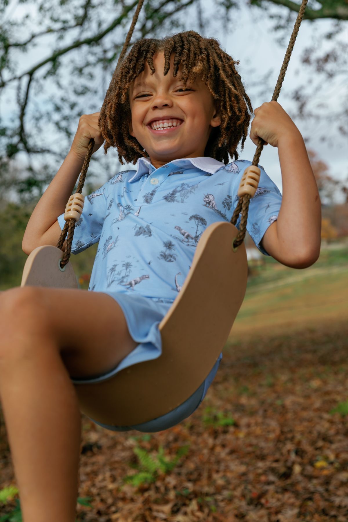 Classic and playful in equal measure, this collared shirt is crafted from our signature soft bamboo fabric for all-day comfort. Featuring a pointed collar and button-down front, it is adorned with our whimsical dinosaur motif on a rich dark-blue background, accented with crisp white piping for a subtle, polished touch.