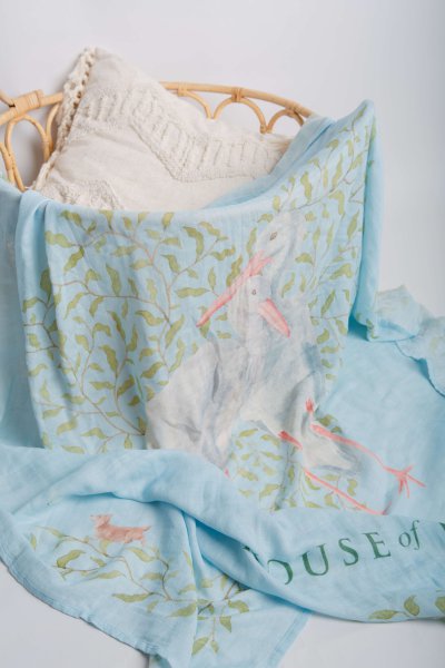 A beautiful gift for newborns and babies. Our luxurious soft bamboo swaddles are silky soft and gets even softer after every wash. The designs on our swaddles are hand-painted and then printed on silky soft bamboo muslin fabric. Each swaddle in this collection features beautiful white storks that symbolizes new birth, making this the perfect gift for baby showers and newborns to say congratulations with. Spot Holly chasing butterflies along the border!
